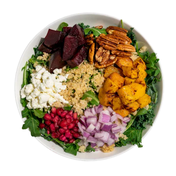Quinoa, massaged kale, arugula, roasted butternut squash, glazed roasted beets, toasted pecans, goat cheese, red onion, pomegranate seeds, maple balsamic dressing.